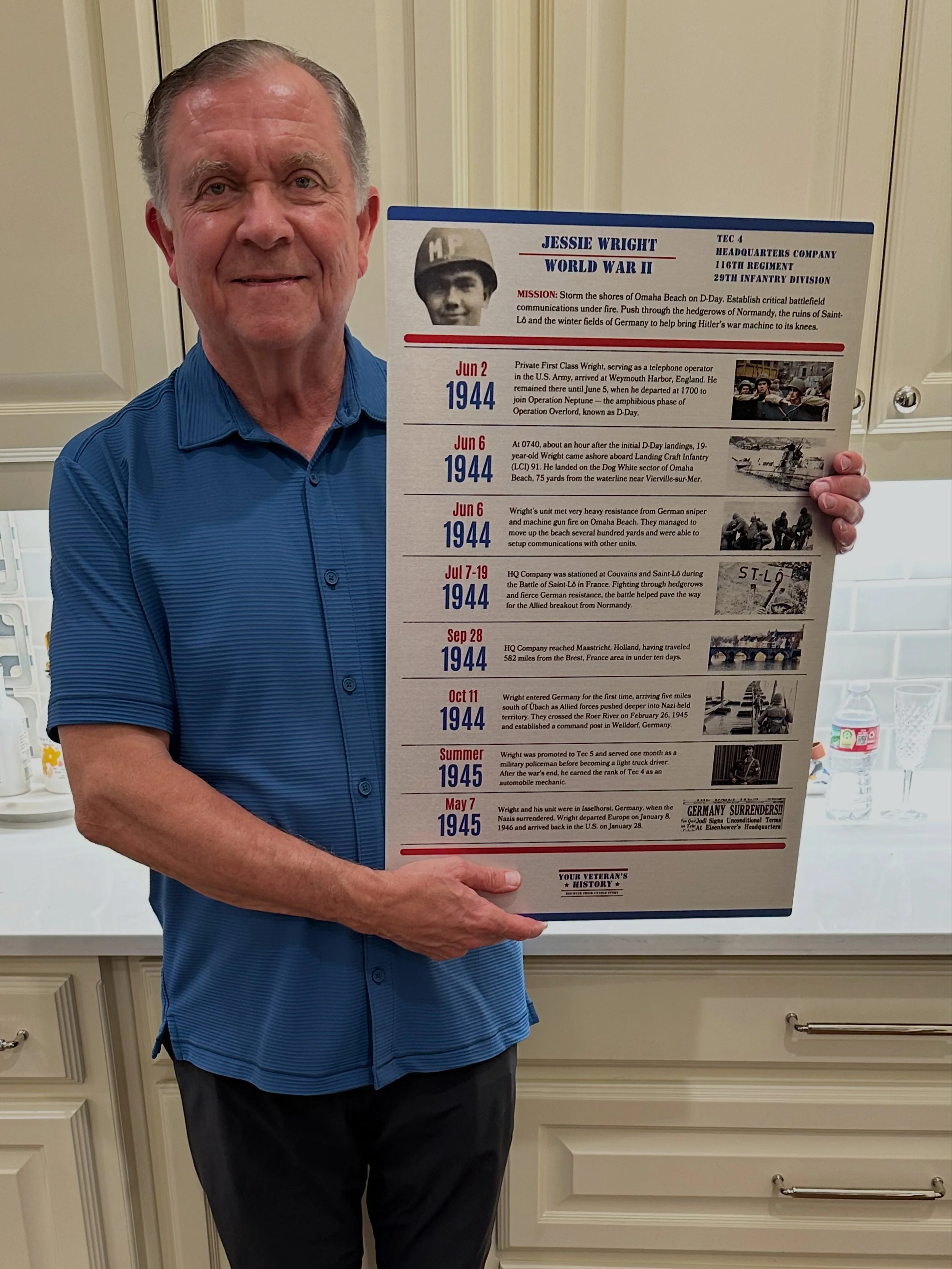 Cliff Wright, Jessie Wright’s grandson, came to us wanting to uncover his grandfather’s full World War II story for their family. Jessie’s son, pictured here, had long tracked his father’s service but never knew the full scope of it. We finally filled in those missing chapters for the Wright family.